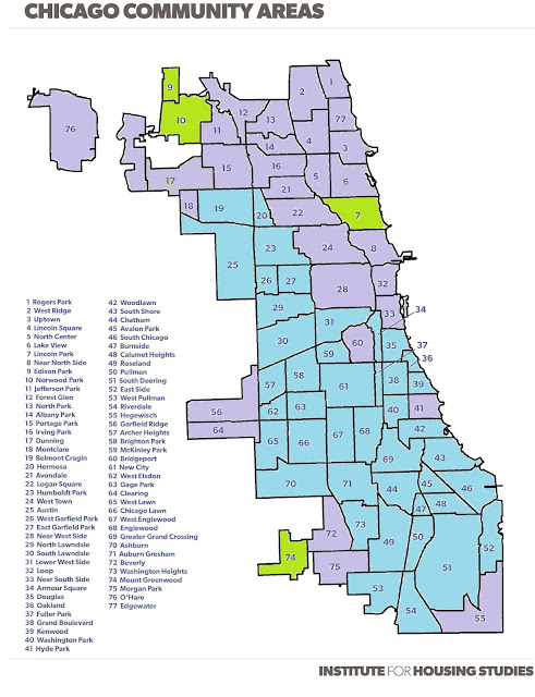 My guess is that many readers look at this and see the loss of green areas and the increase in purple areas and interpret the change as progress; a more integrated Chicago. Indeed, in 1970, 39 of Chicago's 77 CCAs had a white population in excess of 80 percent. Twenty-one CCAs fell into the middle category (20%-80% white), and 17 had minority populations in excess of 80 percent. In 2015 only four CCAs had a white population greater than 80 percent, and 30 had white populations between 20 and 80 percent.